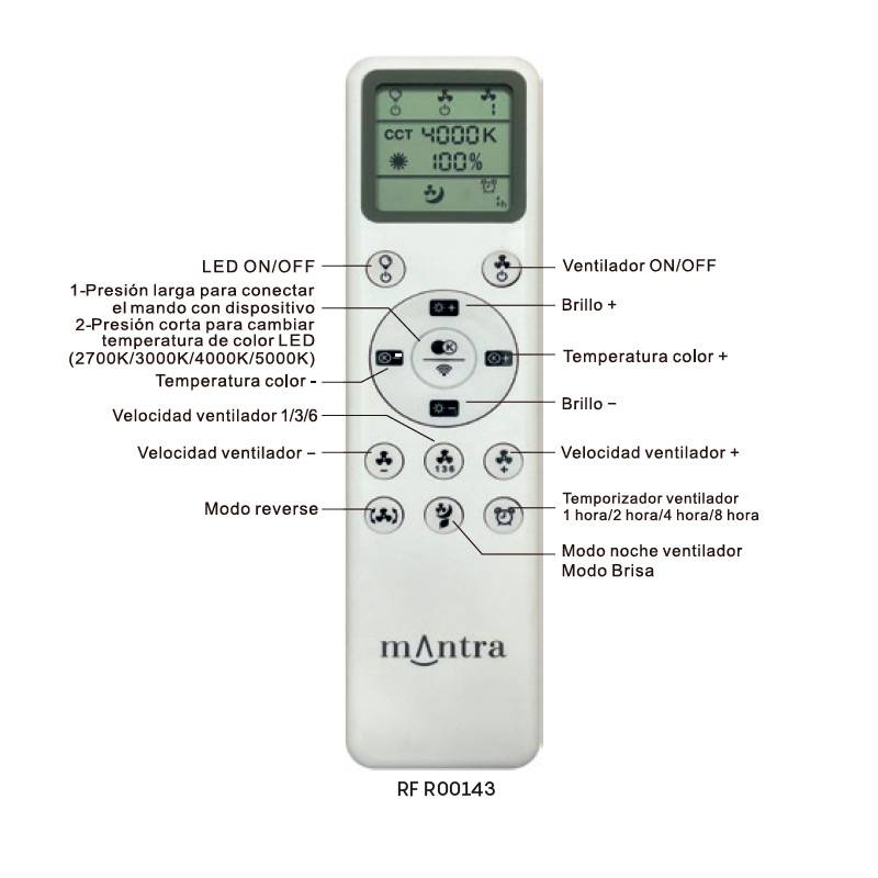Podemos controlar todas las funcionalidades del ventilador desde el mando a distancia digital incluido y también desde la App móvil de Mantra.
